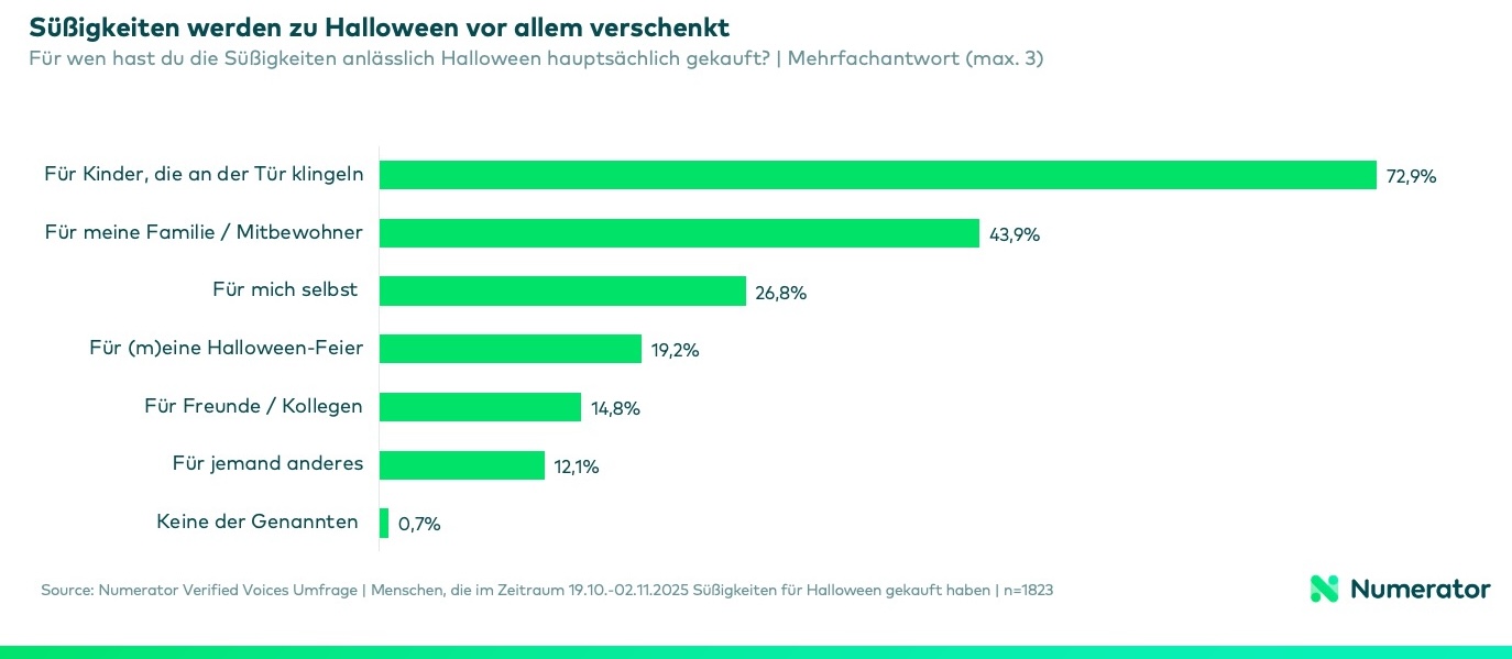 Die Mehrheit der Käufer:innen hat Halloween Süßigkeiten nicht für sich selbst, sondern für andere gekauft. Ganze 72,9 % kauften Süßigkeiten für Kinder, die an der Tür klingeln. Die Mehrheit verteilt also lieber „Süßes”, statt „Saures” zu empfangen.